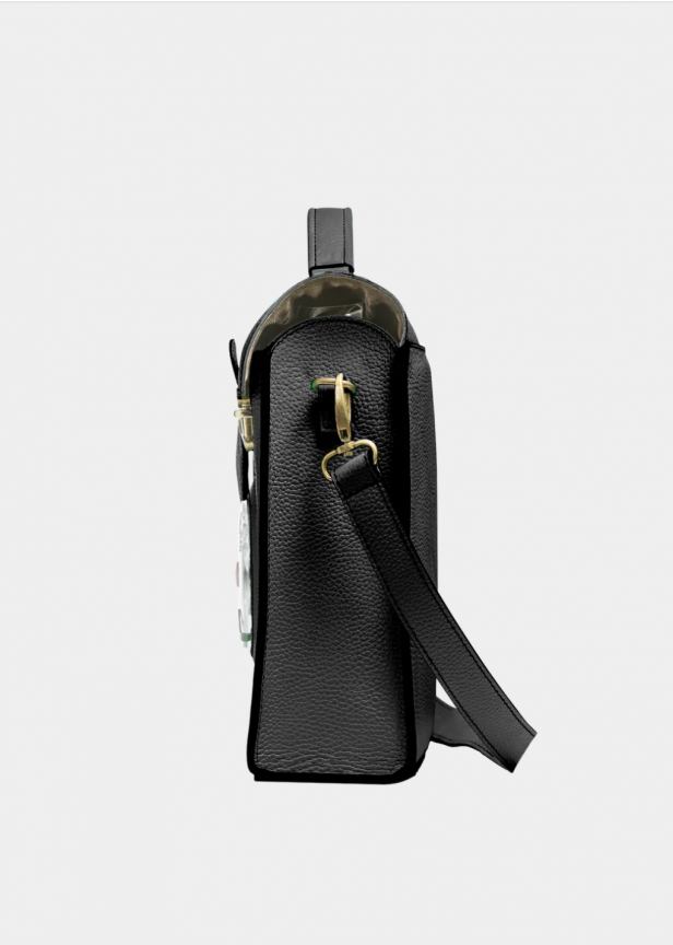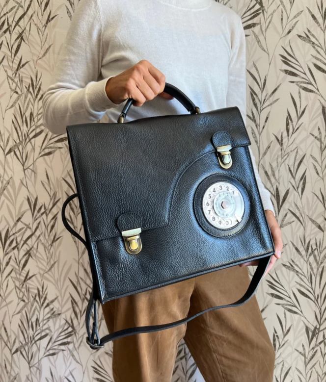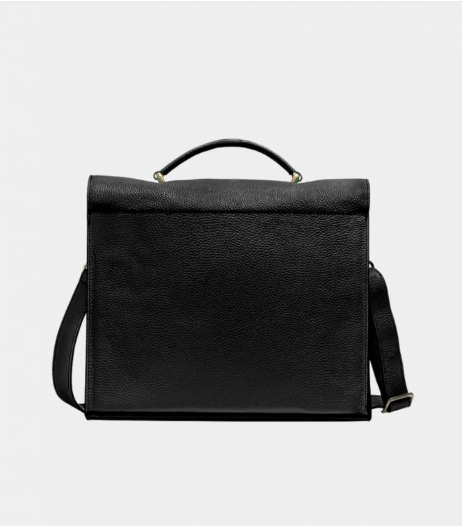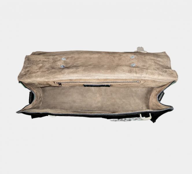 Ampia borsa in pelle con manico e tracolla. Nella forma ricorda una vecchia cartella da lavoro. La patta termina con due chiusure a battente . Tasca interna.
